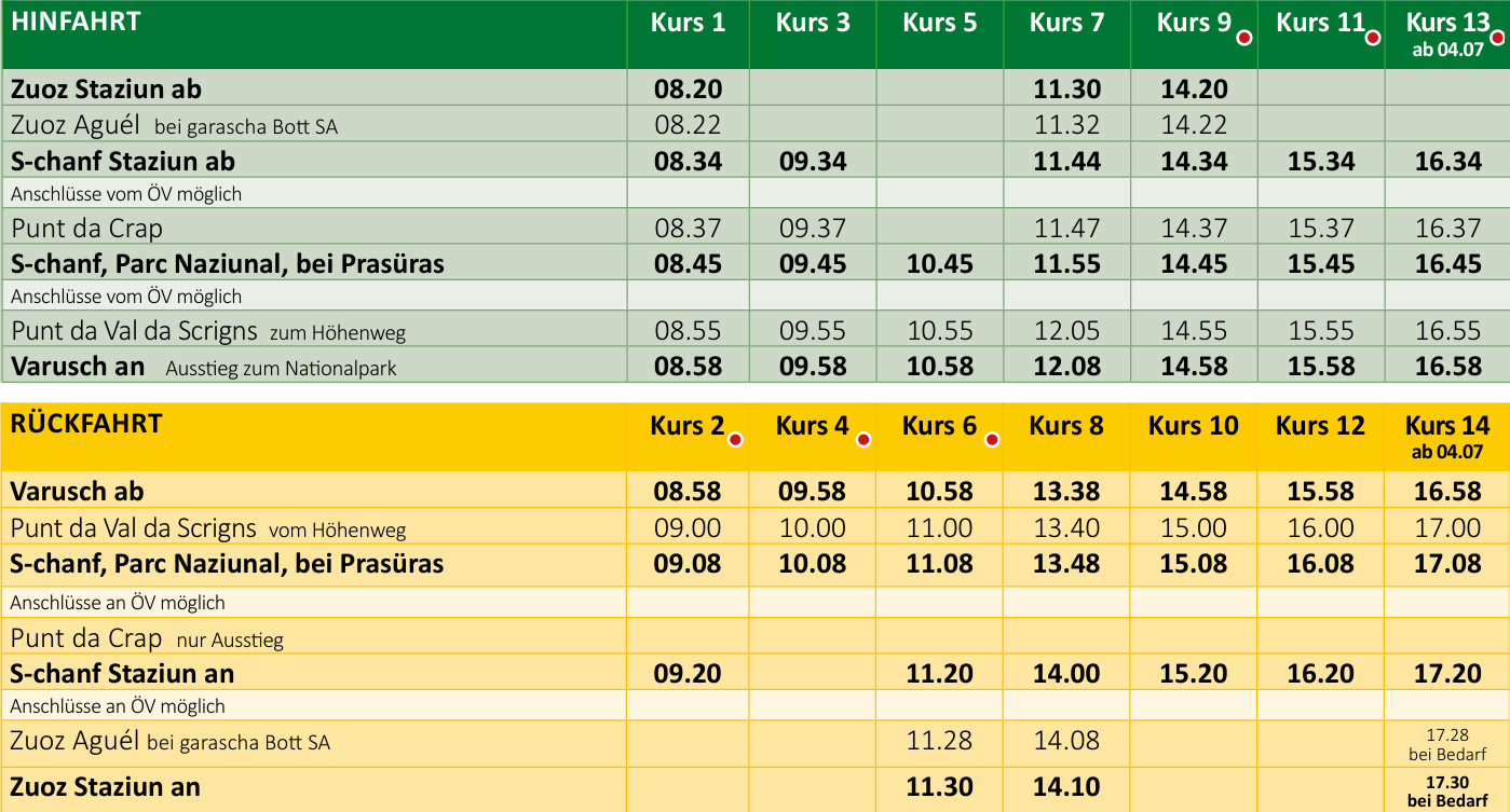 ⬤ Bei den Kursen 2, 4, 6 für die Rückfahrt am Vormittag und 9, 11 und 13 für die Hinfahrt am Nachmittag ist eine telefonische Voranmeldung notwendig. Spätestens 30 Min. vor Abfahrt ohne Aufpreis, unter Tel. +41 79 512 92 87.